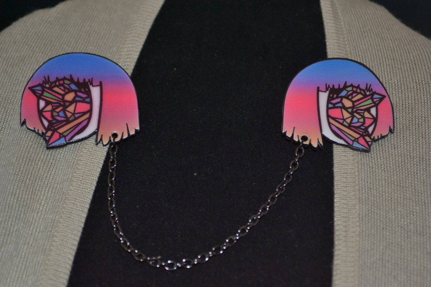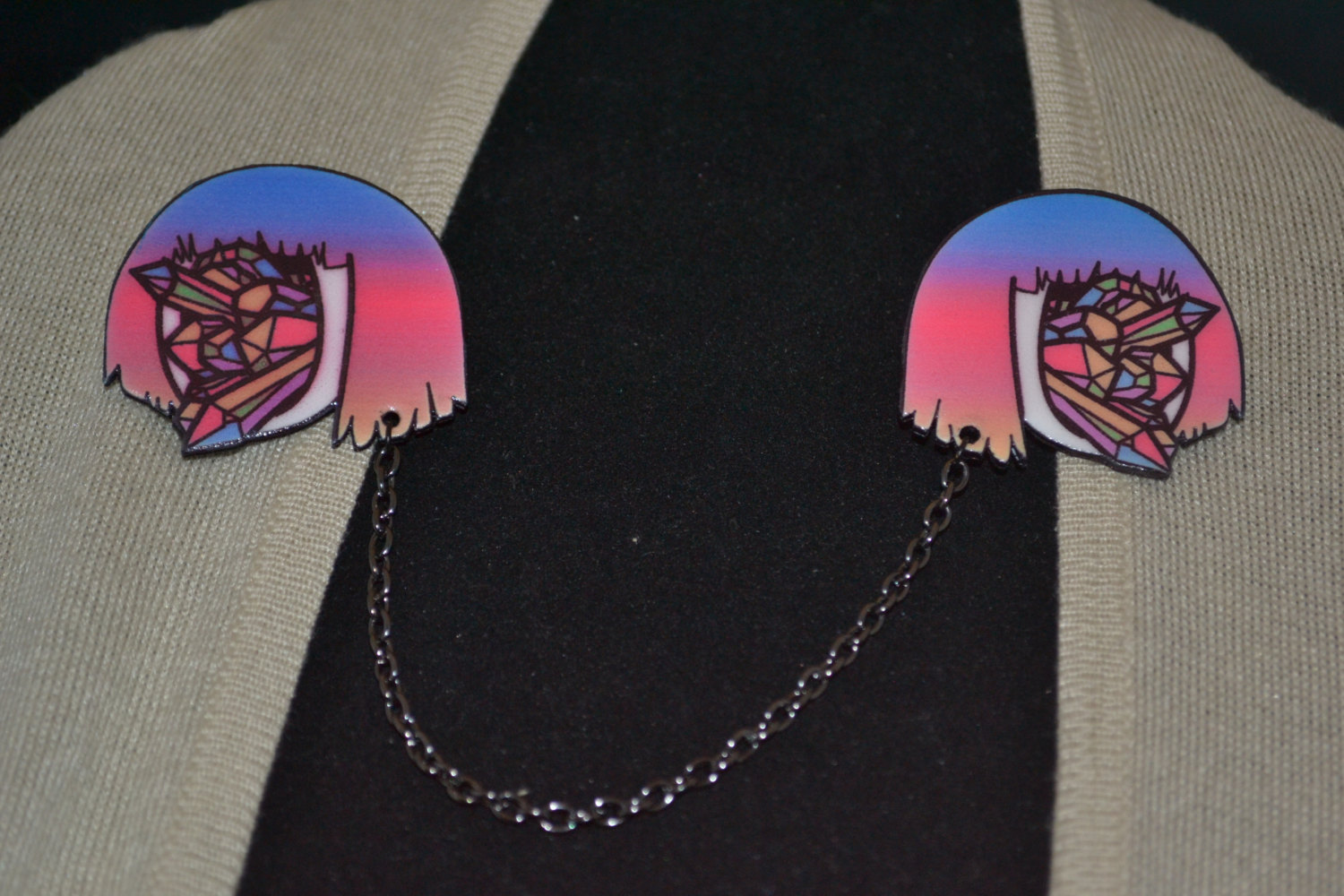 Each handmade collar pin is connected via beautiful silver chain.