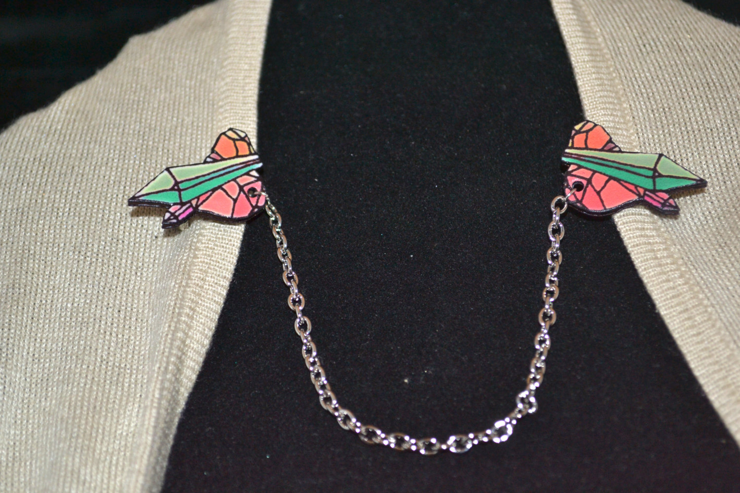 Each handmade collar pin is connected via beautiful silver chain.